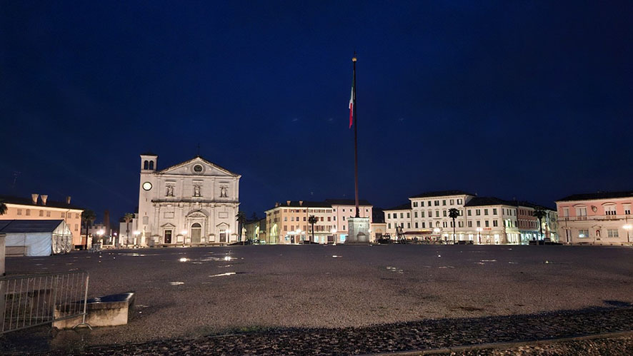 Als erstes fand der traditionelle Stopp in Palmanova im Friaul statt. Ursprünglich als Festungsstadt der Republik Venedig zum Schutz vor den Türken im 16. Jahrhundert angelegt, mit dem sternförmigen Grundriss einer Festung sowie Kasernenanlage, ist es immer wieder ein Genuss rund um den überdimensionierten Hauptplatz, ausgestattet mit einem der größten Fahnenmasten in Norditalien, zu spazieren.