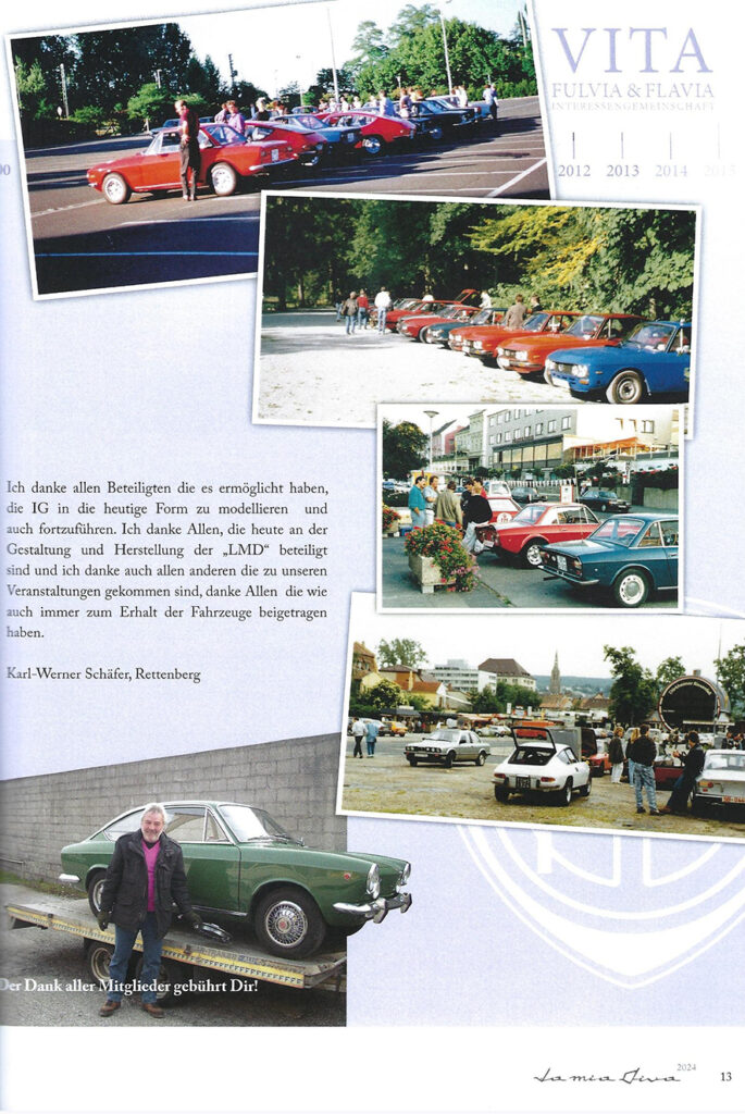 Viele Lancia-Markenclubs haben sich im Laufe der Jahre ihrer Geschichte und Einbettung in die Marken-Landschaft „erinnert“: Lancia Motor Club („Lancia in Britain“, 2014), Lancia Club Nederland („Lancia in Kaart“, 2023), Lancia Club Belgio („25 Anni“, 2002) usw. Die Fulvia & Flavia IG hat 2025 neben der spät erschienenen „La mia Diva“ 2024 auch ein rückblickendes Magazin „VITA“ veröffentlicht. Frau Britta Binder hat Exemplare beider Magazine nach Wien geschickt – herzlichen Dank. Der Jahreskreis der deutschsprachigen Magazine ist geschlossen.