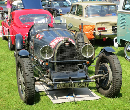 Und dann der Bugatti 51 mit „Ennstal-Pickerl“ und am Reserverad angelaschten Segeltuch-Rucksack für die Reise – am ganz normalen Parkplatz.